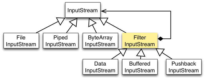 Java I/O 使用了装饰者模式来实现。以 InputStream 为例,InputStream 是抽象组件,FileInputStream 是 InputStream 的子类,属于具体组件,提供了字节流的输入操作。FilterInputStream 属于抽象装饰者,装饰者用于装饰组件,为组件提供额外的功能,例如 BufferedInputStream 为 FileInputStream 提供缓存的功能。
