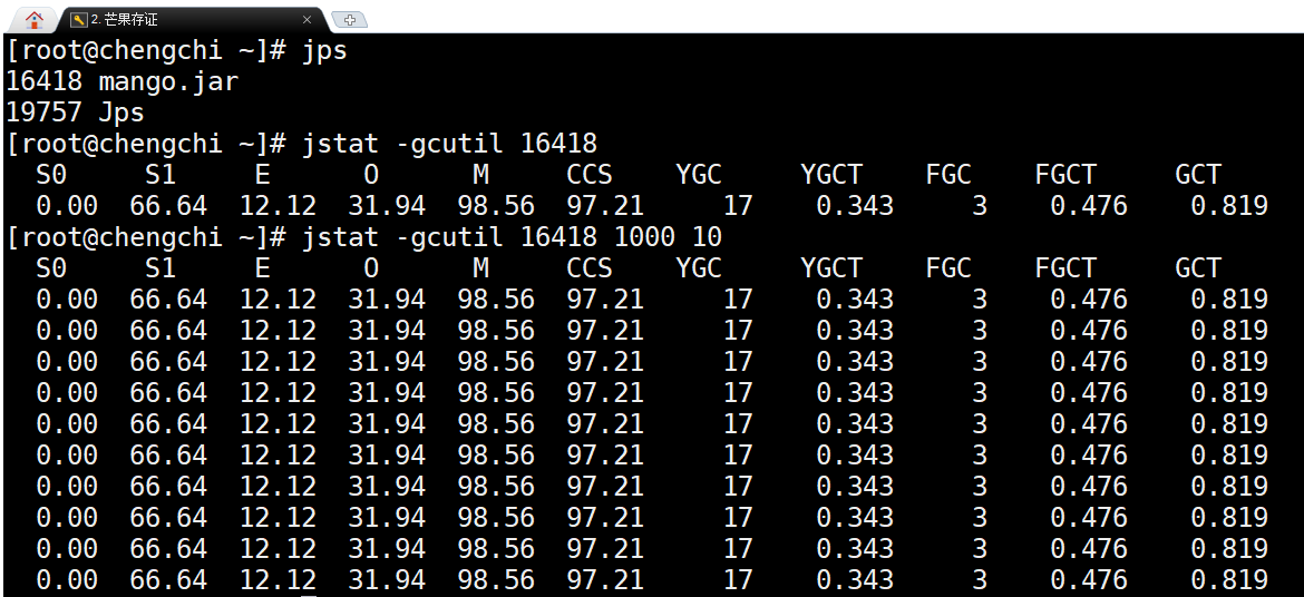 例如:需要每 1000 毫秒查询一次进程 16418 垃圾收集状况,一共查询 10 次,那命令如下: