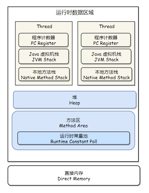 - 方法区 —— 所有类级数据都将存储在这里,包括静态变量。每一个JVM只有一个方法区,并且它是一个共享资源。