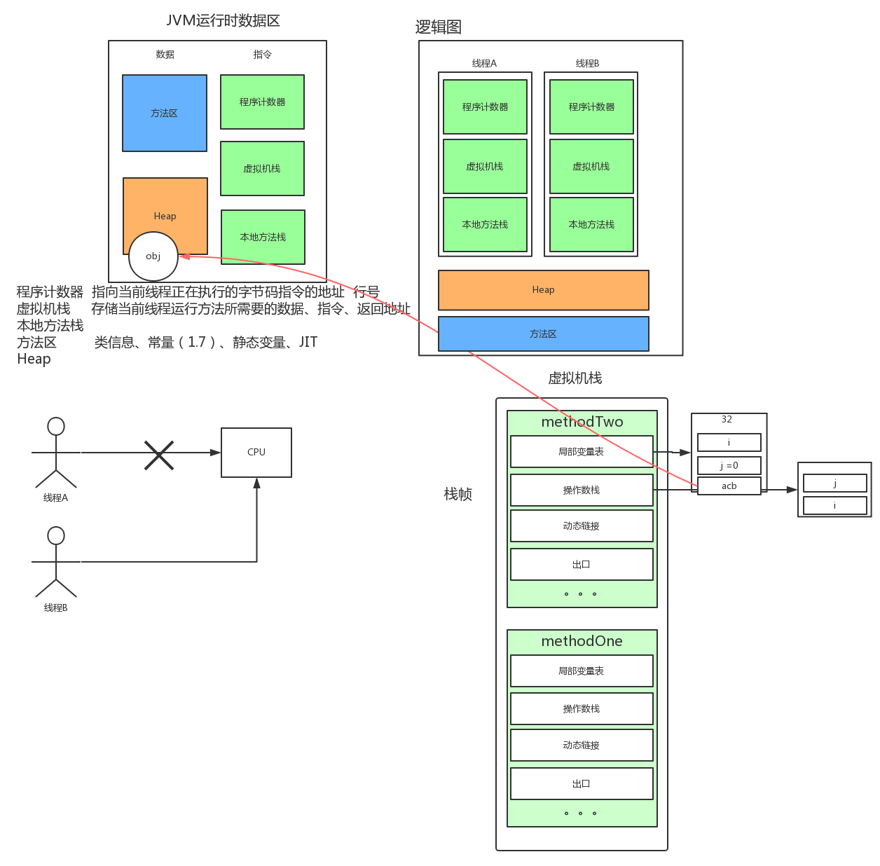 - 堆区 —— 所有对象及其对应的实例变量和数组等存储在此,每个JVM同样只有一个堆区。由于方法区和堆区是多线程内存共享,因此存储的数据是非线程安全的。