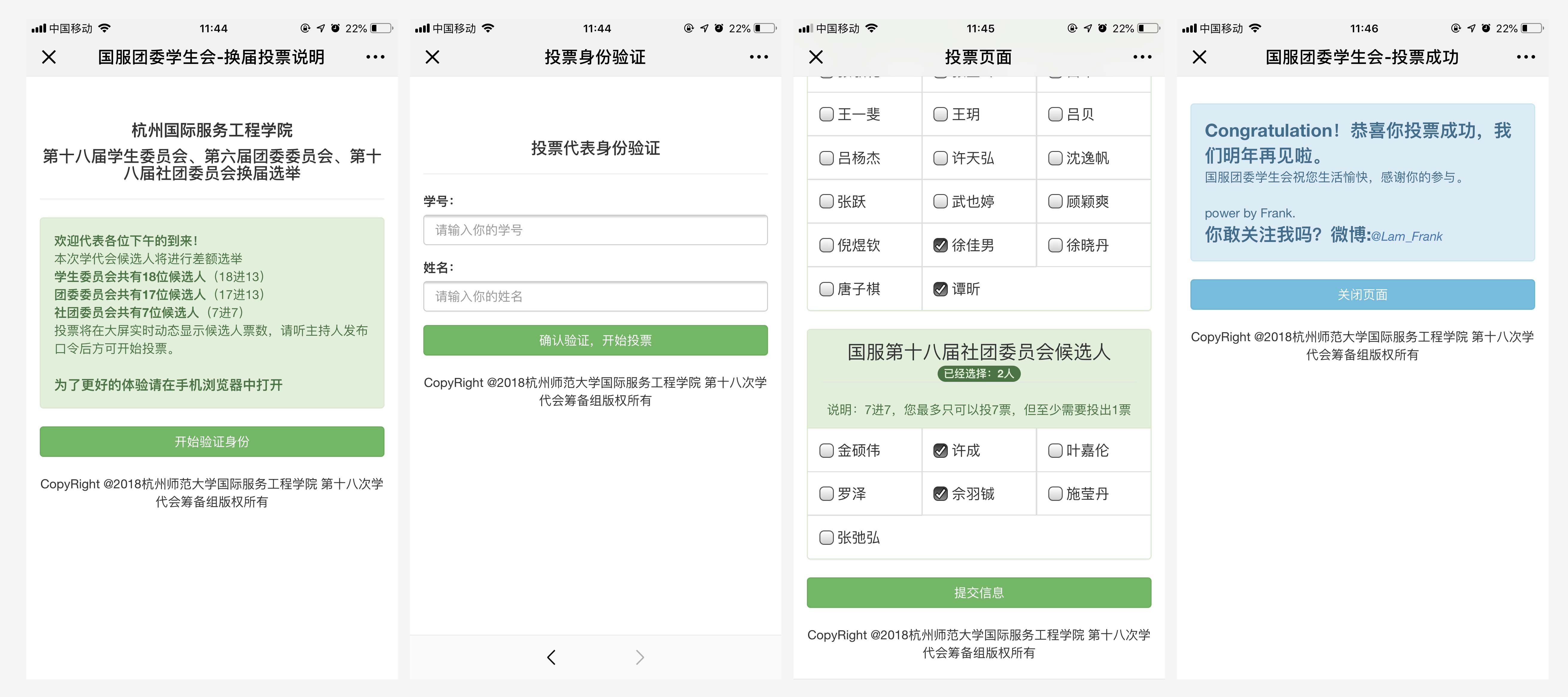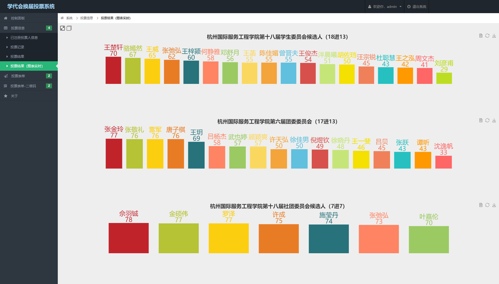 同时在学生工作之余,也为学代会换届投票选举开发了在线实时投票系统,高效解决选票计票的繁琐问题。并实践了三年的版本迭代